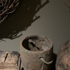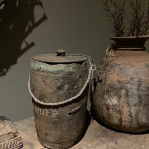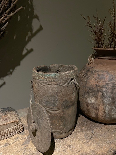 Een stoere, hoge houten pot met deksel met een krachtige landelijke look.